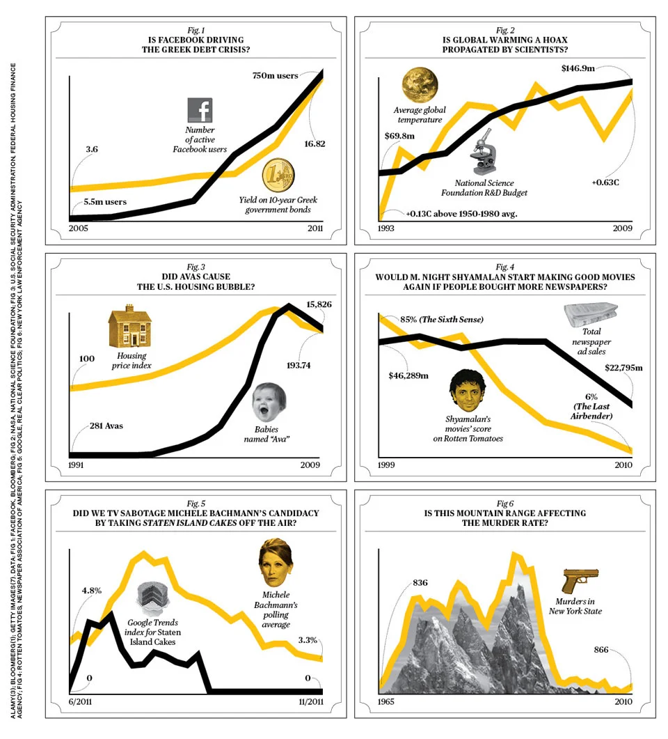So, as you can see, examining correlation and causation can be just as easy as taking a critical look at facts you hear. The next time you come across a study or surprising fact, think to yourself: how could this relationship be influenced by other variables? Are the two variables even related? (see below for some funny correlations that are decidedly not causations)